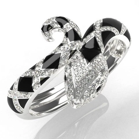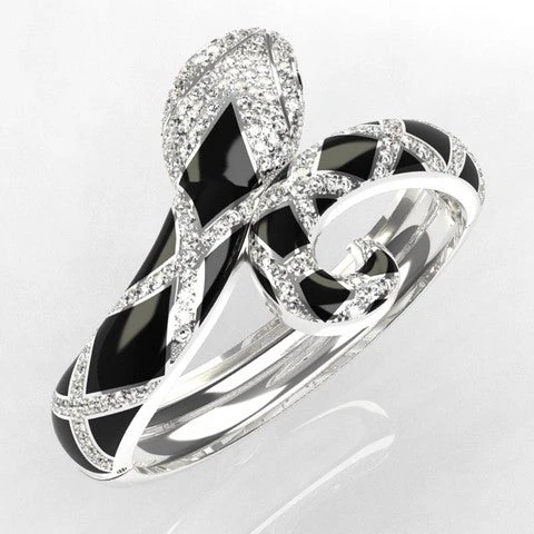 Toute la tête du serpent est sertie de ces mêmes pierres de plus petite taille alors que les yeux du serpent sont symbolisés par deux diamants noirs de 2,8 millimètres de diamètre.