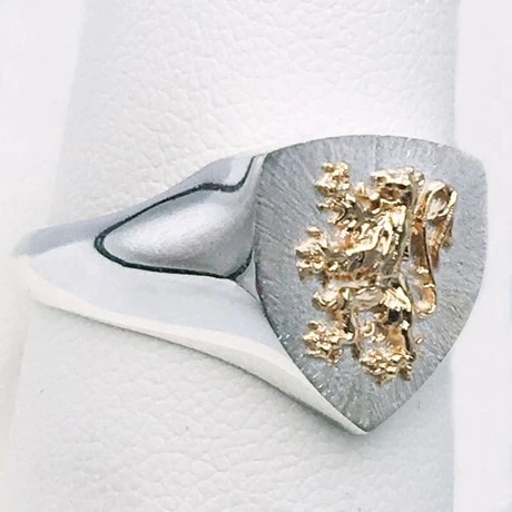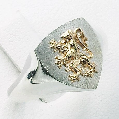 - Argent 925 et Or jaune 18 carats, le corps de bague est en argent 925 et la moulure du lion est en or jaune 18 carats avec un poids total d’or 18 carats de 0,6 gramme