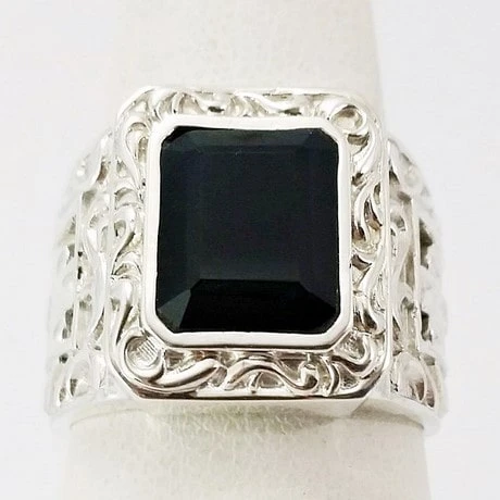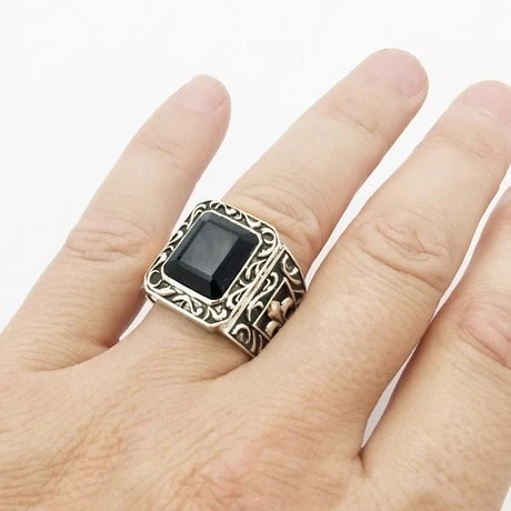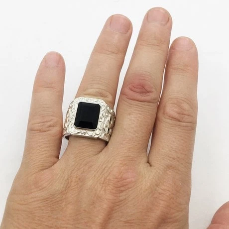 La pierre d’onyx rectangulaire fait 12×10 millimètres alors que le plateau de bague fait 19×15 millimètres, alors que la partie inférieure de la bague fait 11 millimètres de large, il s’agit donc d’une grosse bague onyx massive destinée à un homme aimant les bagues masculines imposantes.
