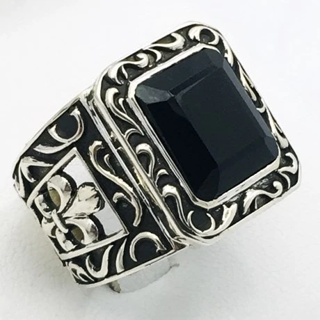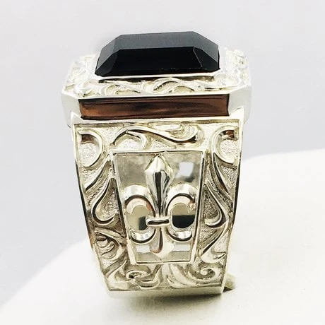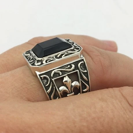 Cette bague se destine à une homme qui recherche une grosse bague onyx noire de style ancien. Il appréciera les contrastes de couleur entre l’argent poli, l’argent brut et le noir profond de la pierre d’onyx ainsi que la touche historique française sous la forme de la fleur de lys latérale.