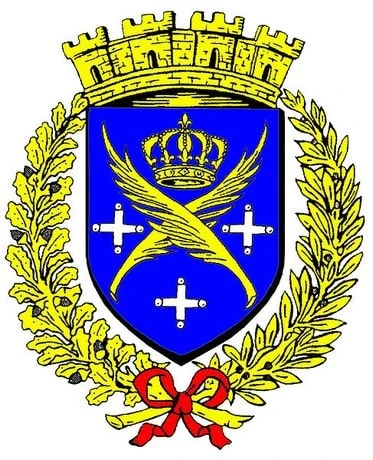 L’écu français ancien timbré de la couronne murale à quatre tours crénelées d’or maçonnées et ouvertes de sable est soutenue par deux branches de chêne (à dextre) et de laurier (à senestre) toutes deux d’or fruitées d’argent, croisées en pointe en sautoir et liées par un noeud de gueule. » (source)
