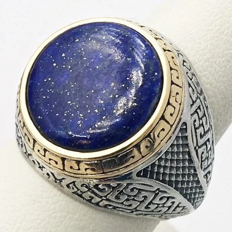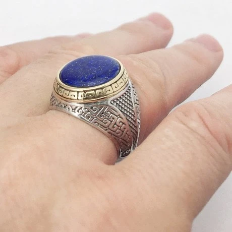 Cette chevalière se compose d’un corps de bague volumineux construit autour d’une pierre naturelle ronde de 16 millimètres qui est légérement bombée. Celle-ci peut-être au choix une pierre d’onyx noire ou bien une pierre de lapis-lazuli.