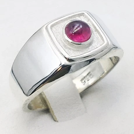 La monture en argent massif, soigneusement polie pour un éclat incomparable, présente des lignes nettes et contemporaines qui mettent en valeur la beauté naturelle du rubis. La forme carrée du plateau ajoute une touche de modernité à cette chevalière classique, tandis que le rubis cabochon, avec sa surface lisse et bombée, capte la lumière de manière envoûtante, créant des reflets profonds et vibrants.