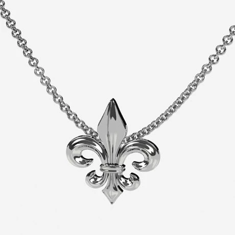 Collier constituĂ© d’une chaĂ®ne maille gourmette de 1,2 millimètre de large et 42 centimètres de longueur Ă laquelle est suspendue un pendentif fleur de Lys de 12 millimètres de large et 13,5 millimètres de hauteur dont le passant de chaĂ®ne est invisible, cachĂ© au dos du pendentif.
