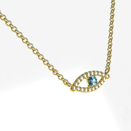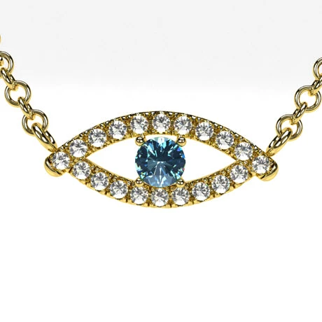 Collier en forme de chaîne supportant une représentation en or massif du mauvais oeil, lequel est réhaussé d’une pierre de topaze au centre et d’un sertissage de petits diamants blancs de 1,3 millimètre de diamètre entourant tout le pourtour de l’oeil.