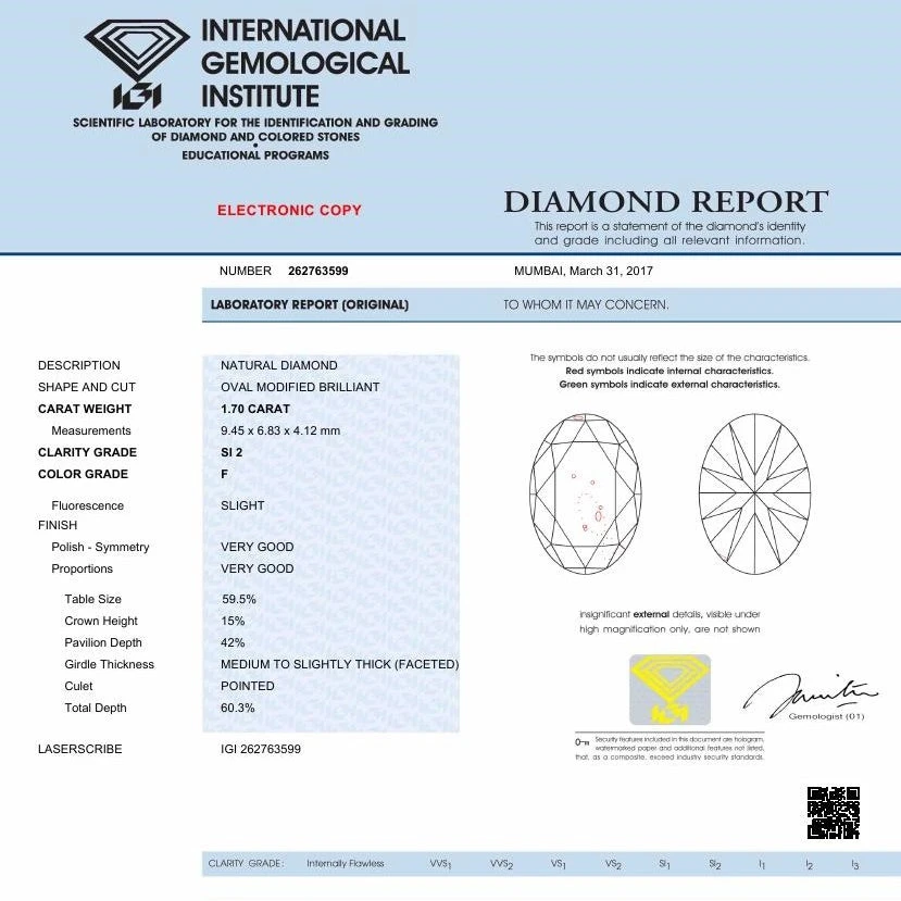 Ce diamant est une pierre précieuse relativement grosse et assez chère puisqu’elle fait 1,7 carat en poids est mesure 9,5×6,7 millimètres. Vous remarquerez le visuel montrant le certificat de laboratoire de la pierre ainsi que le dessin répertoriant les défauts (mineurs) de la pierre.