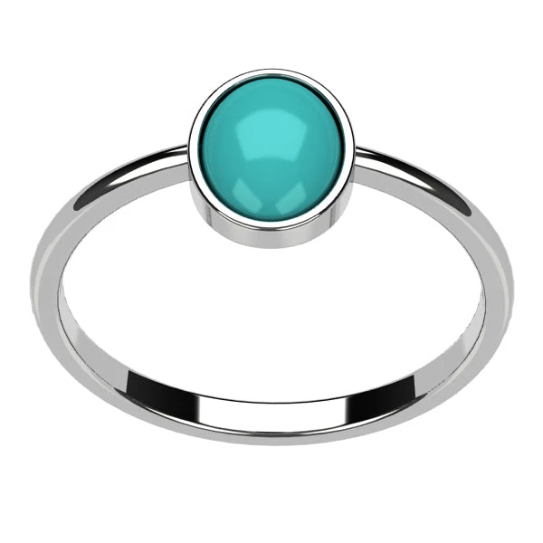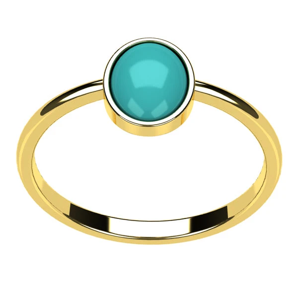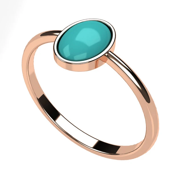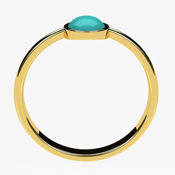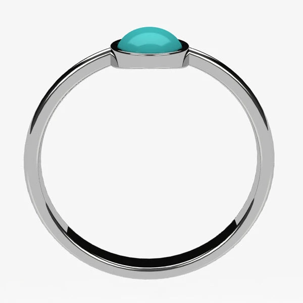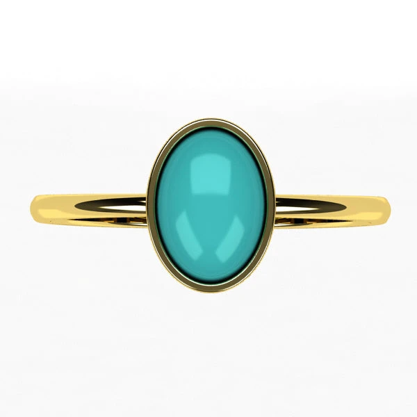 Bague au design épuré présentant une pierre de turquoise ovale de 7 par 5 millimètres sertie clos, ce qui rend la pierre bien visible au doigt sans être top ostentatoire.