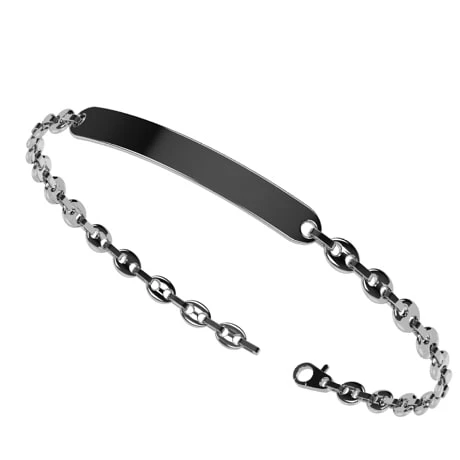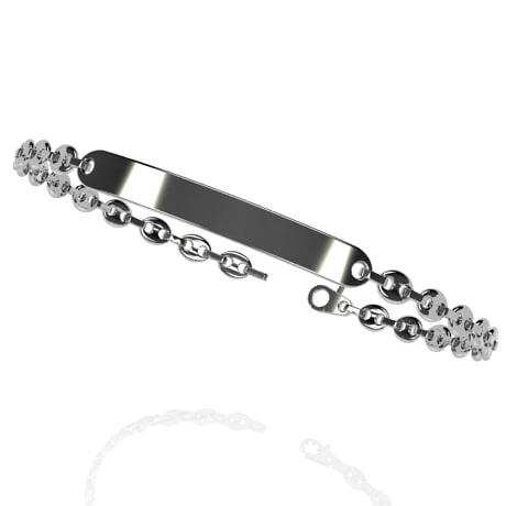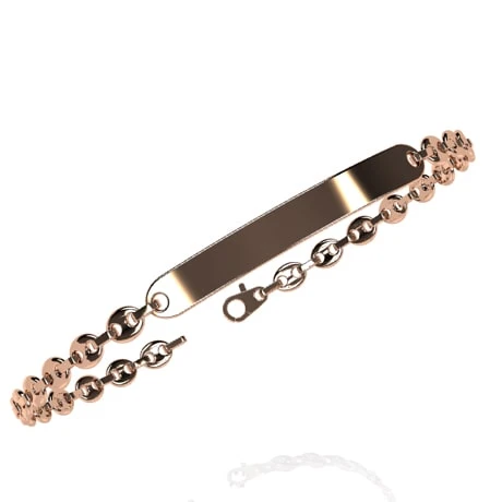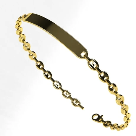 Ce bracelet de type gourmette est composé d’une chaîne à maille grain de café de 4 millimètres de large comprenant au centre une plaque cintrée en or 18 carats laminé de 5 millimètres de large et 40 millimètres de longueur et terminé par un fermoir de type menotte.