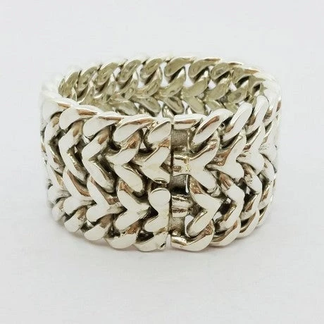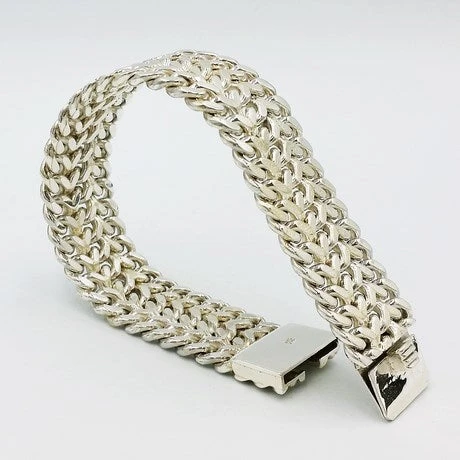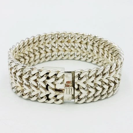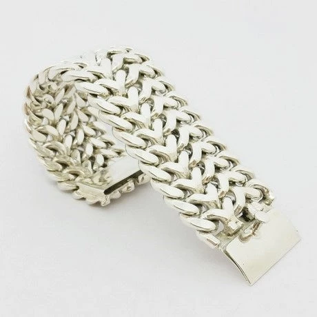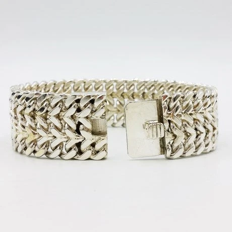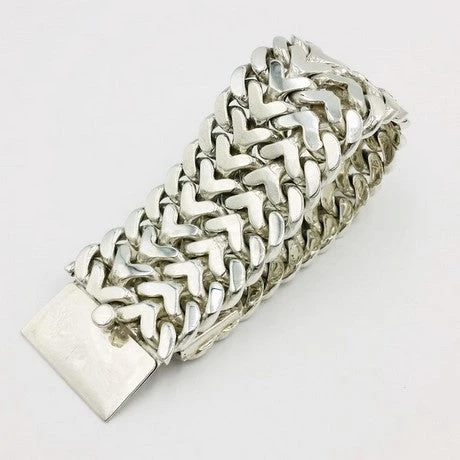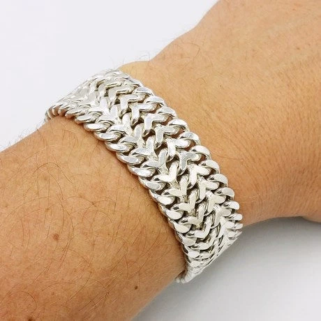 Ce bracelet est particulièrement large et lourd surtout, mesurant 37 millimètres de large et composé de grosses mailles massives en argent plein, il pèse environ 250/300 grammes et parfois plus si votre bracelet est long.