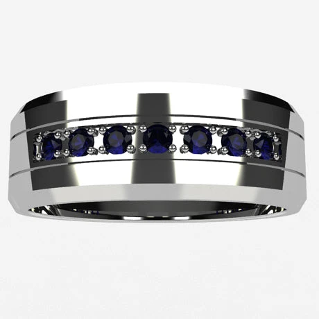 Alliance de mariage qui ravira un homme recherchant une bague large et massive au style moderne et coloré. Il appréciera les pierres précieuses de saphir bleu qui tranche sur le design épuré de cette alliance.