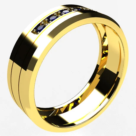 Alliance large pour homme offrant un design moderne et épuré assortis de 6 petits saphirs bleus sertis par griffes en partie supérieure. Cette bague de mariage se compose d’un anneau de 8 millimètres de large assez épais puisqu’il fait 1,7 millimètres d’épaisseur tout en étant évidé à l’intérieure afin de ne pas créer un surpoids d’or qui impacterait le prix de cette bague.
