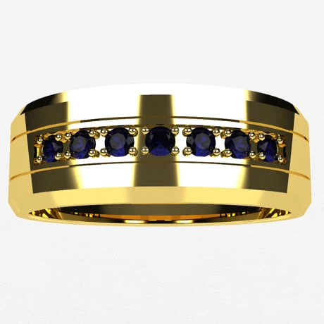 La partie supérieure de la bague présente un évidemment recevant 7 petits saphirs bleus de 2 millimètres de diamètres et sertis par 4 griffes chacun. La position de ces pierres précieuses, en retrait par rapport à la surface de la bague les maintient à l’abris des chocs et des accrocs et vous assure une très bonne durabilité de leur sertissage.