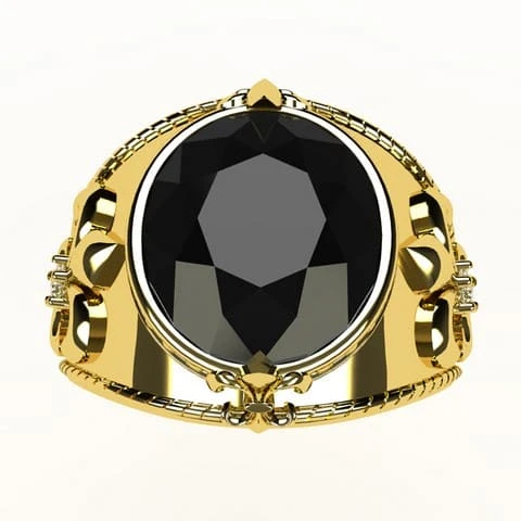 Ce modèle de chevalière pour homme en or massif présente une grosse pierre d’onyx naturelle taillée en facettes de forme ovale. Cette derniere est sertie avec deux petites moulures en forme de fleur de lys à ses extrémités et par un sertis de part et d’autre sur ses flancs.