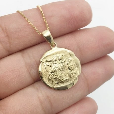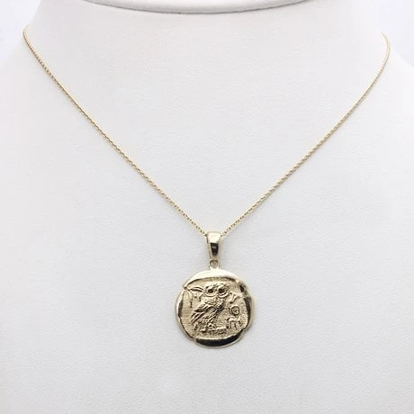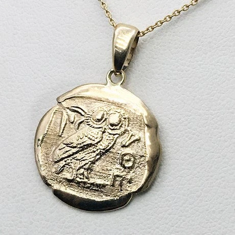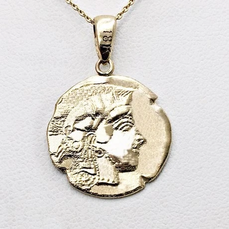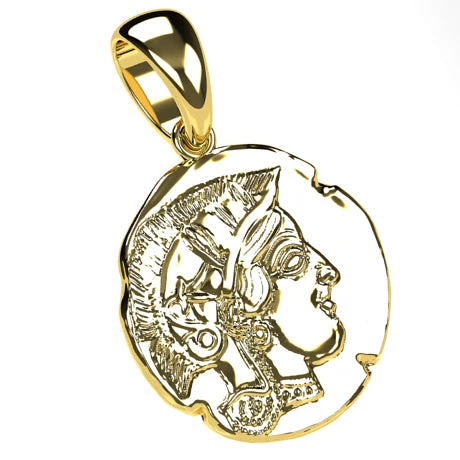 Médaille destinée à être porter en pendentif, copie d’une pièce de monnaie grecque antique provenant d’Athènes et faites d’argent à l’époque. Cette médaille est une reproduction confirme en or massif 18 carats de la pièce d’époque en argent.