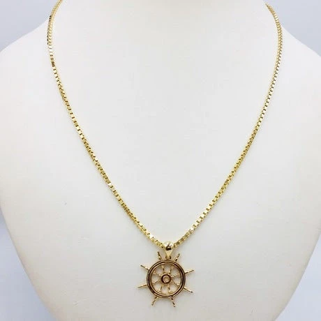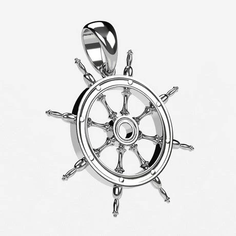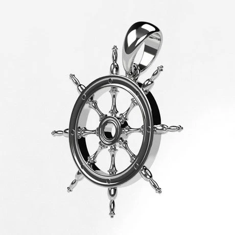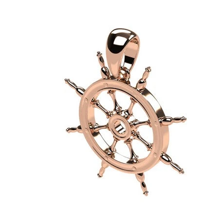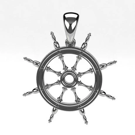 Avec ce design, nous avons voulu présenté un pendentif sobre, mais bien reconnaissable de ce type de gouvernail à roue, sachant que la forme circulaire se prête bien à une multitude de personnalisations possibles avec des pierres serties sur le pourtour de la roue ou bien en placant une ancre de marine au centre de la roue.