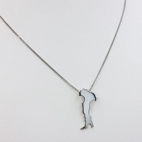 Vous remarquerez le passant de chaîne invisible au dos du pendentif qui laisse mieux voir les contours de la carte du pays.