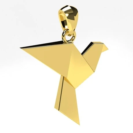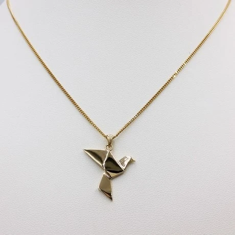 Ce pendentif présente la silhouette d’une colombe en vol en or massif. Ce design en forme d’origami reproduit les lignes de l’oiseau, vous reconnaîtrez la tête, les ailes et la queue de la colombe si caractéristique.