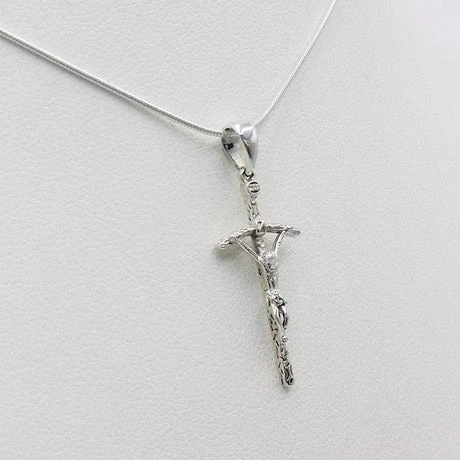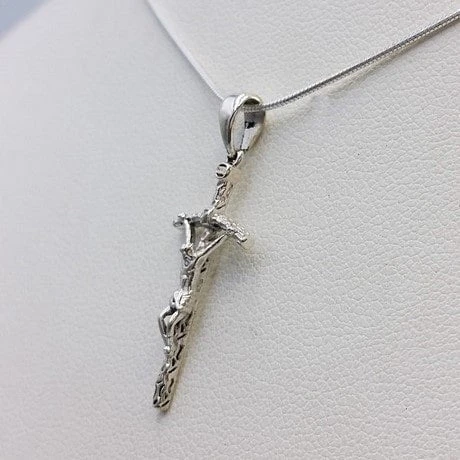 Pendentif représentant Jésus Christ cruxifié sur la croix. Ce petit pendentif est fin et se veut réaliste. Il représente la croix en boix avec la gravure des nervures du bois ainsi que le Christ torse nu avec la tête baissé et la couronne d’épine sur la tête.