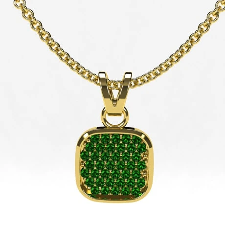 Pendentif de forme carrée au design original et masculin sertis d’un pavage d’émeraudes qui donnera un style sobre et luxueux porté autour du cou. Le pendentif se compose d’une base de forme carrée aux bords et aux angles arrondis et dont le rebord extérieur en relief présente un chanfrein qui donne un effet lumineux intéressant et dont le rebord protège le pavage de pierres.