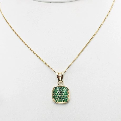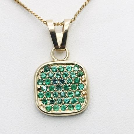 Ce pendentif au design unique (que nous avons créé dans notre atelier) donnera un style élégant à un homme recherchant un pendentif avec pierres précieuses d’émeraude verte sobre et masculin qui reste abordable pour son budget. Il appréciera la forme sobre tranchant sur la vive couleur verte des pierres précieuses serties sur le bijou.