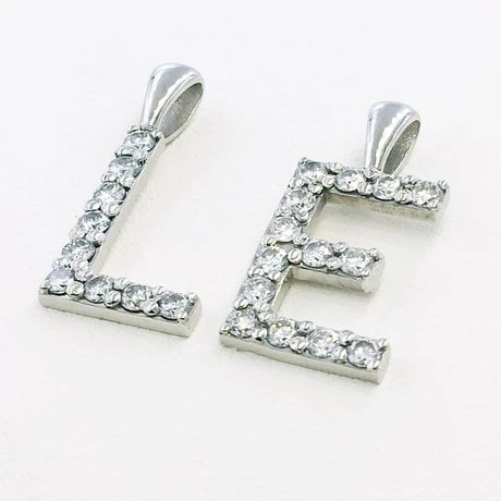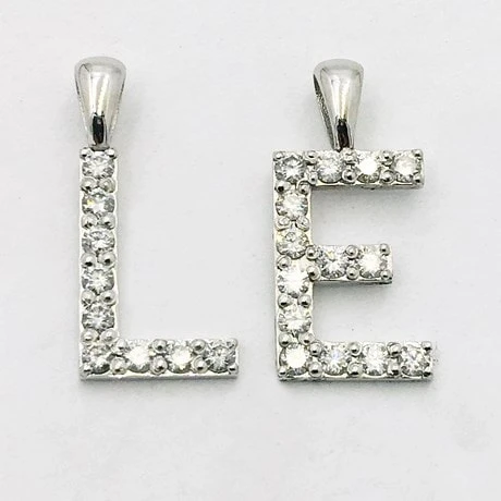 L’ensemble de l’initiale considérée est recouverte d’un pavage de petits diamants blancs de qualité HSI, faisant 2 millimètres de diamètre et maintenu en place par 4 griffes. Chacun des diamants pèse 0,03 carat avec un total de 0,42 carat de diamant pour la lettre E (avec 14 diamants) et de 0,27 carat de diamant pour la lettre L (avec 9 diamants).