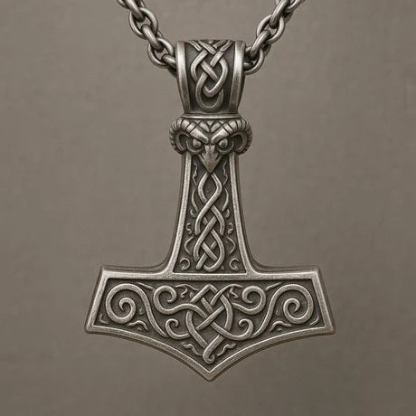 Sur la tête du marteau (partie horizontale), des spirales enroulées s’opposent symétriquement, encadrant un nœud entrelacé central. Ces motifs sont directement inspirés de l’art viking dit « Urnes » (fin XIe siècle), connu pour ses lignes fluides, torsades, et courbes élancées représentant la force, la protection et l’interconnexion du monde.