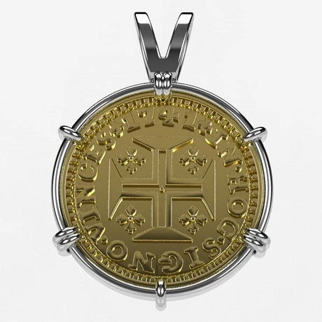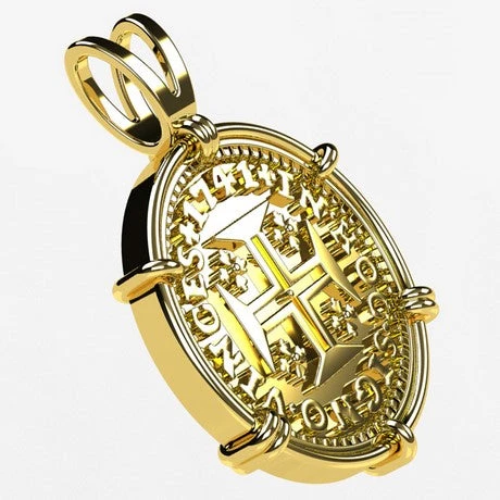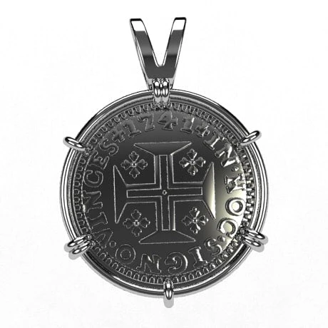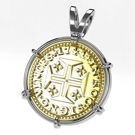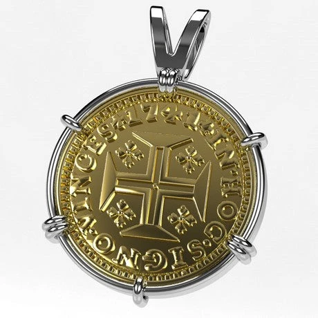 Il s’agit d’un pendentif sous forme de monture supportant la reproduction d’un escudo en or: une pièce ancienne portugaise de 400 Reais datant du XVIII° siècle et frappée en 1741 comme on peut le voir sur la gravure de la piece. Attention, si la pièce de monnaie antique portugaise nous ayant servi de modèle était en or 22 carats (soit 91,7% d’or), il s’agit ici d’une reproduction de cette pièce en or jaune 18 carats qui n’est gravée que d’une seule face sur le recto, le verso étant laissé lisse.