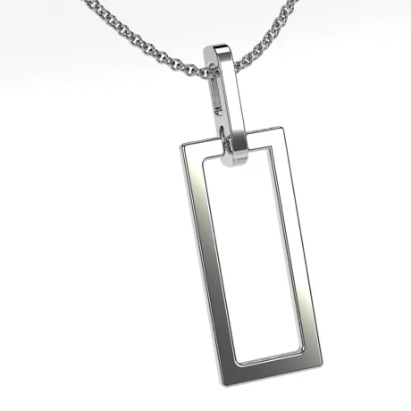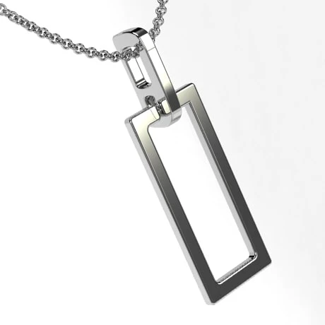 Au niveau de l’attache du passant de chaîne, la section carrée du rectangle se transforme en une tige ronde de 1 millimètre de diamètre afin de laisser le rectangle principal libre de ses mouvements par rapport au passant de chaîne, ce qui le rend plus confortable à porter au cou.