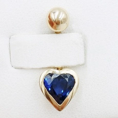 Cette pierre de sahir bleu est taillée en coeur et fait 7,6×8 millimètres de côté, elle pèse 1,9 carat et présente une très jolie teinte bleue foncée qui la rend tout simplement superbe. Vous pouvez admirer sur les photos les nuances de bleu foncé de la pierre de saphir et notamment son rendu visuel une fois monté sur un piercing en or jaune 18 carats.