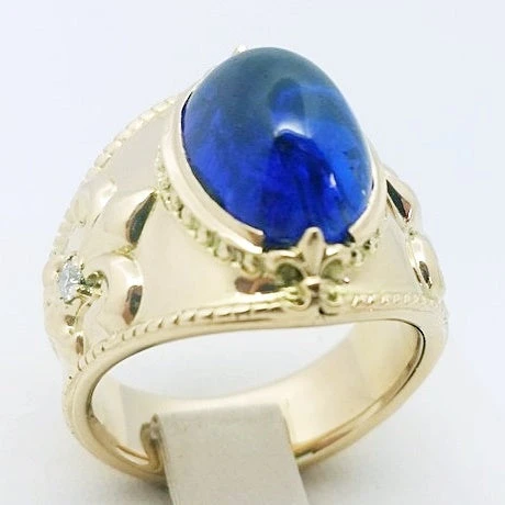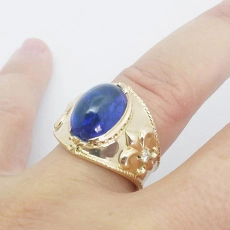 Vous remarquerez sa teinte bleu/violet profond qui a été montée sur une grande chevaliere en or 18 carats ornée de fleurs de lys et de diamants qui est une modification de notre design de chevalière de notre boutique visible ici.